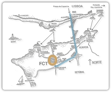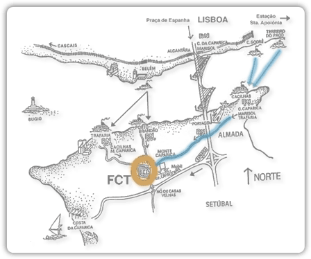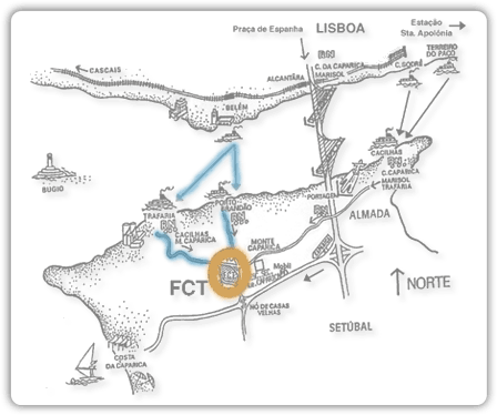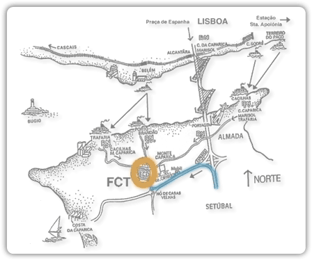 Take the A2 high-way to the "Setúbal" direction, then turn right after the "25 de Abril" bridge, taking the "Caparica" direction. Drive through the "Costa de Caparica" road till the "Universidade" (University) exit.